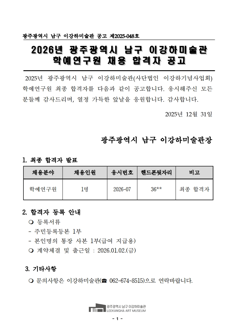 [¾È³»] 2026 À̰ÇϹ̼ú°ü Çп¹¿¬±¸¿ø ÃÖÁ¾ ÇÕ°ÝÀÚ ¹ßÇ¥