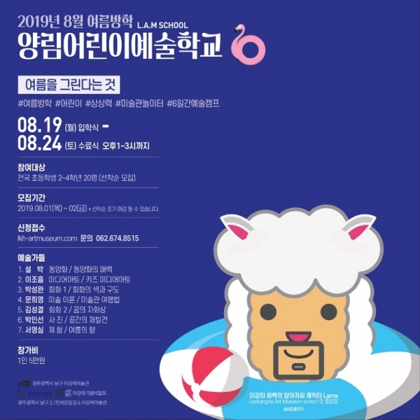 ¾î¸°ÀÌ¿¹¼úÇб³ ¸ðÁý±â°£Àº 8¿ù 1ÀÏ ºÎÅÍ 2ÀÏ ±îÁö¸ç Àü±¹ ÃʵîÇб³ 2~4Çг⿡ ÀçÇÐ ÁßÀÎ ¾î¸°À̰¡ ´ë»óÀ̸ç, ¸ðÁýÀοøÀº 20¸íÀÌ´Ù. ¾î¸°ÀÌ¿¹¼úÇб³´Â ¡®¿©¸§À» ±×¸°´Ù´Â °Í¡¯À» ÁÖÁ¦·Î »ï¾Ò´Ù. °á°ú¹°¿¡¸¸ ÀÇÁ¸ÇÏ´Â ±âÁ¸ÀÇ ¹Ì¼ú ÇÁ·Î±×·¥À» Å»ÇÇÇØ ¼ø¼öÇÑ ¹Ì¼úÀÇ ¸Å·Â°ú °úÁ¤À» ´À²¸ º¸´Â âÀÇÀûÀÎ ¹®È¿¹¼ú ±³À°ÀÌ µÇµµ·Ï ÇÁ·Î±×·¥À» ±¸¼ºÇß´Ù. ±³À°ÀÇ ¼¼ºÎ ³»¿ëÀº ¿ì¸® °¢ÀÚ°¡ ¿©¸§À» ±â¾ïÇÏ´Â ´Ù¾çÇÑ ¹æ¹ýÀ» »ó»óÇϰí, ŰÁî ¹Ìµð¾î¾ÆÆ®, ¾î¸°ÀÌ Å¥·¹ÀÌÅÍ, ¿©¸§ÀÇ Çâ ¸¸µé±â, °ø°£ÀÇ Àç¹ß°ß, ²ÞÀÇ ÀÚÈ»ó±×¸®±â µîÀ¸·Î ´Ù¾çÇÏ°Ô ÁغñÇß´Ù. ÇöÁ÷ Ȱ¡·Î Ȱ¹ßÇÏ°Ô È°µ¿Çϰí ÀÖ´Â ±è¼º°á, ÀÌÁ¶Èì, ¼³ ¹Ú, ¹ÚÀμ±, ¹®Èñ¿µ, ¹Ú¼º¿Ï, ¼¿µ½Ç ÃÑ 7¸íÀÇ ÀÛ°¡°¡ ±³À°°ú ½Ç½ÀÀ» µµ¿ï ¿¹Á¤ÀÌ´Ù. 6Àϰ£ÀÇ ±³À°¿¡ °á¼® ¾øÀÌ ¼º½ÇÇÏ°Ô Âü¿©ÇÑ Çлýµé¿¡°Ô´Â ±¤ÁÖ ±¸¸³ À̰ÇϹ̼ú°ü¿¡¼ ÁغñÇÑ ¡®Á¦3±â ¾ç¸²¾î¸°¿¹¼úÇб³ ¼ö·áÁõ¡¯ÀÌ ¹ß±ÞµÈ´Ù.