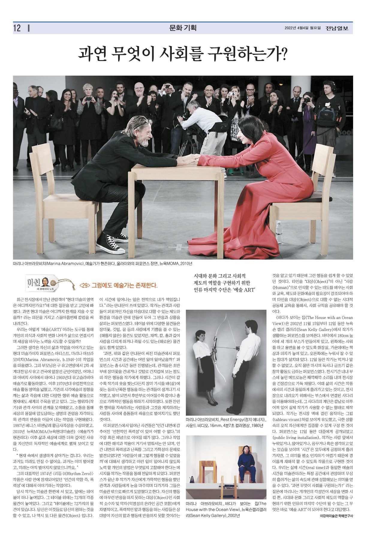 ±×·¯ÇÑ »ý°¢Àº ÀÚ½ÅÀÇ »î°ú ÀÛ¾÷À» À̾°í ÀÖ´Â Çö´ë ¹Ì¼ú°¡ÀÌÀÚ ÆÛÆ÷¸Õ½º ¾ÆÆ¼½ºÆ®, ¸¶¸®³ª ¾Æºê¶ó¸ðºñÄ¡(Marina Abramovic, b.1946~)ÀÇ ÀÛ¾÷µéÀ» ¶°¿Ã·È´Ù. ±×ÀÇ ºÎ¸ð´ÔÀº ±¸ À¯°í¿¬¹æ¿¡¼ 2Â÷ ¼¼°è´ëÀü ´ç½Ã À¯°í °Ç±¹¿¡ ¾ÕÀå¼± ±ºÀÎÀ̾ú´ø, ¾î¸Ó´Ï¿Í ¾Æ¹öÁö »çÀÌ¿¡¼ ž 1960³â´ë À¯°í½½¶óºñ¾Æ ¿¹¼ú°¡·Î Ȱµ¿ÇÏ¿´´Ù. ÀÌÈÄ 1970³â´ë À¯·´Àü¿ªÀ¸·Î ¿¹¼ú Ȱµ¿ ¿µ¿ªÀ» ³ÐÇû°í, ±âÁ¸ÀÇ ½Ã°¢¿¹¼úÀÇ Á¤ÇüÀ» ±ú´Â »î°ú Á×À½¿¡ ´ëÇÑ ´Ù¾çÇÑ ÇàÀ§ ¿¹¼ú Ȱµ¿À¸·Î ÇöÀç¿¡µµ ¼¼°èÀÇ ÁÖ¸ñÀ» ¹Þ°í ÀÖ´Ù. ±×´Â ÇàÀ§ÀÚ(ÀÛ°¡)¿Í °ü°´ »çÀÌÀÇ °ü°è¸¦ ¸ð»öÇØ¿Ô°í, ¼ÒÅëÀ» ÅëÇØ ¼¼»óÀÇ ¹°Áú¿¡ ¾Ðµµ´çÇÏ´Â »ý¸íÀÇ Á¸¾öÀ» ÀÚ°¢Çϵµ·Ï °ü°´ÀÇ ¹ÝÀÀÀ» À̲ø¾î ³»´Â ÀÛ¾÷À» ±¸ÇöÇØ¿Ô´Ù. 1997³â º£´Ï½º ºñ¿£³¯·¹ Ȳ±Ý»çÀÚ»óÀ» ¼ö»óÇÏ¿´°í, 2010³â ´º¿åMOMA(´º¿åÇö´ë¹Ì¼ú°ü) <¿¹¼ú°¡°¡ ÇöÁ¸ÇÏ´Ù> ÀÌÈÄ »î°ú ¼¼»ó¿¡ ´ëÇÑ ´õ¿í ±í¾îÁø »çÀ¯¸¦ ÀڽŸ¸ÀÇ µ¶ÀÚÀûÀÎ ¿¹¼ú¼¼°è·Î ÆîÃÄ º¸À̰í ÀÖ´Ù.