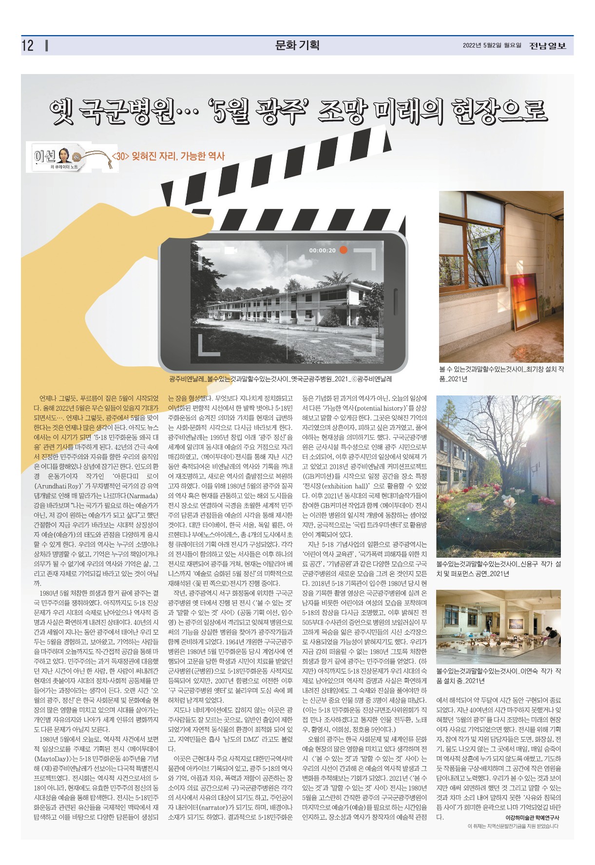 À̰÷Àº ±ÙÇö´ë»ç ÁÖ¿ä »çÀûÁö·Î ´ëÇѹα¹¿ª»ç¹Ú¹°°ü¿¡ ¾ÆÄ«ÀÌºê ±â·ÏµÇ¾î ÀÖ°í, ±¤ÁÖ 5.18ÀÇ ¿ª»ç¿Í ±â¾ï, ¾ÆÇİú Ä¡À¯, Æø·Â°ú ÀúÇ×ÀÌ °øÁ¸ÇÏ´Â Àå¼ÒÀÌÀÚ ÀÇ·á °ø°£À¸·Î½á ±¸)±¹±º±¤ÁÖº´¿øÀº °¢°¢ÀÇ ¼»ç¿¡¼ »çÀ¯ÀÇ ´ë»óÀÌ µÇ±âµµ Çϰí, ÁÖÀΰøÀÌÀÚ ³»·¯ÀÌÅÍ(narrator)°¡ µÇ±âµµ Çϸç, ¹è°æÀ̳ª ¼ÒÀç°¡ µÇ±âµµ ÇÏ¿´´Ù. °á°úÀûÀ¸·Î 5.18¹ÎÁÖȿÀº ±â³äÈ µÈ °ú°ÅÀÇ ¿ª»ç°¡ ¾Æ´Ñ, ¿À´ÃÀÇ Àϻ󿡼 ´Ù¸¥ '°¡´ÉÇÑ ¿ª»ç(potential history)'¸¦ »ó»óÇØº¸°í ¸»ÇÒ ¼ö ÀÖ°Ô²û ÇÑ´Ù. ±×°÷Àº ÀØÇôÁø ±â¾ïÀÇ ÀÚ¸®¿´À¸¸ç »óÈçÀÌÀÚ, ÇÇÇÏ°í ½ÍÀº °ú°Å¿´°í, Ç®¾î¾ßÇÏ´Â ÇöÀ缺À» ÀǹÌÇϱ⵵ Çß´Ù. ±¸±¹±º±¤ÁÖº´¿ø´Â ±º»ç½Ã¼³ Ư¼ö¼ºÀ¸·Î ÀÎÇØ ±¤ÁÖ ½Ã¹ÎÀ¸·ÎºÎÅÍ ¼Ò¿ÜµÇ¾î, ÀÌÈÄ ±¤ÁֽùÎÀÇ Àϻ󿡼 ÀØÇôÁ® °¡°í ÀÖ¾ú°í 2018³â ±¤ÁÖºñ¿£³¯·¹ Ä¿¹Ì¼ÇÇÁ·ÎÁ§Æ®(GBÄ¿¹Ì¼Ç)¸¦ ½ÃÀÛÀ¸·Î ÀÏÁ¤ °ø°£À» Àå¼Ò ƯÁ¤ 'Àü½ÃÀå(exhibition hall)' À¸·Î Ȱ¿ëÇÒ ¼ö ÀÖ¾ú´Ù. ÀÌÈÄ 2021³â µ¿½Ã´ëÀÇ ±¹Á¦ Çö´ë¹Ì¼úÀÛ°¡µéÀÌ Âü¿©ÇÑ GBÄ¿¹Ì¼Ç ÀÛ¾÷°ú ÇÔ²² <¸ÞÀÌÅõµ¥ÀÌ> Àü½Ã´Â ÀÌ·¯ÇÑ º´¿øÀÇ ÀϽÃÀû °³¹æ¿¡ µ¿ÂüÇÏ´Â ¼ÀÀ̾úÁö¸¸, ±Ã±ØÀûÀ¸·Î´Â '±¹¸³ Æ®¶ó¿ì¸¶¼¾ÅÍ'·Î Ȱ¿ë¹æ¾ÈÀÌ °èȹµÇ¾î ÀÖ´Ù. Áö³ 5.18 ±â³ä»ç¾÷ÀÇ ÀÏȯÀ¸·Î ±¤ÁÖ±¤¿ª½Ã´Â '¾î¸°ÀÌ ¿ª»ç ±³À°°ü', '±¹°¡Æø·Â ÇÇÇØÀÚ¸¦ À§ÇÑ Ä¡·á °ø°£', '±â³ä°ø¿ø'°ú °°Àº ´Ù¾çÇÑ ¸ð½ÀÀ¸·Î ±¸±¹±º±¤ÁÖº´¿øÀÇ »õ·Î¿î ¸ð½ÀÀ» ±×·Á ¿Â °ÍÀÎÁö ¸ð¸¥´Ù. 2018³â 5.18 ±â·Ï°üÀÌ ÀÔ¼öÇÑ 1980³â ´ç½Ã ÇöÀåÀ» ±â·ÏÇÑ ÃÔ¿µ ¿µ»óÀº ±¹±º±¤ÁÖº´¿ø¿¡ ½Ç·Á ¿Â ³²ÀÚ¸¦ ºñ·ÔÇÑ ¾î¸°ÀÌ¿Í ¿©¼ºÀÇ ¸ð½ÀÀ» Æ÷ÂøÇϸç 5.18ÀÇ Âü»óÀ» ´Ù½Ã±Ý Á¶¸íÇß°í, ÀÌÈÄ ¹àÇôÁø Àü505ºÎ´ë ¼ö»ç°üÀÇ Áõ¾ðÀ¸·Î º´¿øÀÇ º¸ÀÏ·¯½ÇÀÌ ¹«°íÇÏ°Ô ¸ñ¼ûÀ» ÀÒÀº ±¤ÁֽùεéÀÇ ½Ã½Å ¼Ò°¢ÀåÀ¸·Î »ç¿ëµÇ¾úÀ» °¡´É¼ºÀÌ ¹àÇôÁö±âµµ Çß´Ù. ¿ì¸®°¡ Áö±Ý °¨È÷ ¶°¿Ã¸± ¼ö ¾ø´Â 1980³â ±×Åä·Ï óÂüÇÑ Èñ»ý°ú Ç×°Å ³¡¿¡ ±¤ÁÖ´Â ¹ÎÁÖÁÖÀǸ¦ ¾ò¾ú´Ù. (ÇÏÁö¸¸) ¾ÆÁ÷±îÁöµµ 5.18 Áø»ó¹®Á¦°¡ ¿ì¸® ½Ã´ëÀÇ ¼÷Á¦·Î ³²¾ÆÀÖÀ¸¸ç ¿ª»çÀû Áõ¸í°ú »ç½ÇÀº È®¿¬ÇÏ°Ô ³»·ÁÁø »óÅÂÀÓ¿¡µµ ±× ¼÷Á¦¿Í Áø½ÇÀ» Ç®¾î¾ß¸¸ ÇÏ´Â ½Å±ººÎ Áß¿ä Àι° 5¸í Áß 3¸íÀÌ ¼¼»óÀ» ¶°³µ´Ù. (ÀÌ´Â 5.18 ¹ÎÁÖȿ Áø»ó±Ô¸éÁ¶»çÀ§¿øÈ¸°¡ Á÷Á¢ ¸¸³ª Á¶»çÇϰڴٰí ÅëÁöÇÑ Àι° ÀüµÎȯ, ³ëÅ¿ì, Ȳ¿µ½Ã, ÀÌÈñ¼º, Á¤È£¿ë 5ÀÎÀÌ´Ù.)