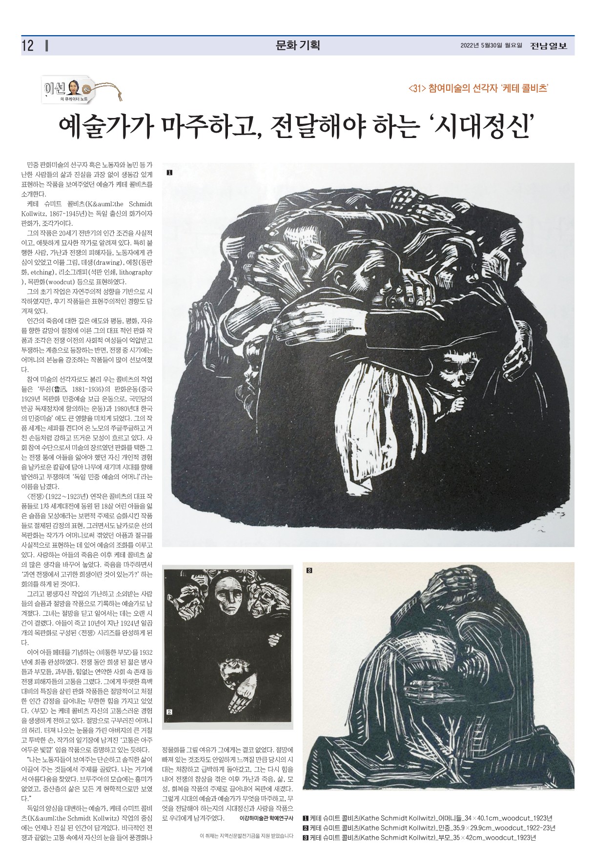 µ¶ÀÏÀÇ ¾ç½ÉÀ» ´ëº¯ÇÏ´Â ¿¹¼ú°¡, ÄÉÅ× ½´¹ÌÆ® ÄݺñÃ÷(Käthe Schmidt Kollwitz) ÀÛ¾÷ÀÇ Á߽ɿ¡´Â ¾ðÁ¦³ª Áø½Ç µÈ Àΰ£ÀÌ ´ã°ÜÀÖ´Ù. ºñ±ØÀûÀÎ ÀüÀï°ú ³¡¾ø´Â °íÅë ¼Ó¿¡¼ ÀÚ½ÅÀÇ ´«À» µé¾î dz°æÈ³ª Á¤¹°È¸¦ ±×¸± ¿©À¯°¡ ±×¿¡°Ô´Â °áÄÚ ¾ø¾ú´Ù. Àý¸Á¿¡ ºüÁ® ÀÖ´Â °ÍÁ¶Â÷µµ ¾ÈÀÏÇÏ°Ô ´À²¸Áú ¸¸Å ´ç½ÃÀÇ ½Ã´ë´Â óÂüÇÏ°í ±Þ¹ÚÇÏ°Ô µ¹¾Æ°¬°í, ±×´Â ´Ù½Ã ÈûÀ» ³»¾î ÀüÀïÀÇ Âü»óÀ» °ÞÀº ÀÌÈÄ °¡³°ú Á×À½, »î, ¸ð¼º, ȸº¹À» ÀÛǰÀÇ ÁÖÁ¦·Î ²ø¾î³»¾î ¸ñÆÇ¿¡ »õ°å´Ù. ±×·¸°Ô ½Ã´ëÀÇ ¿¹¼ú°ú ¿¹¼ú°¡°¡ ¹«¾ùÀ» ¸¶ÁÖÇϰí, ¹«¾ùÀ» Àü´ÞÇØ¾ß ÇÏ´ÂÁöÀÇ ½Ã´ëÁ¤½Å°ú »ç¶ûÀ» ÀÛǰÀ¸·Î ¿ì¸®¿¡°Ô ³²°ÜÁÖ¾ú´Ù.