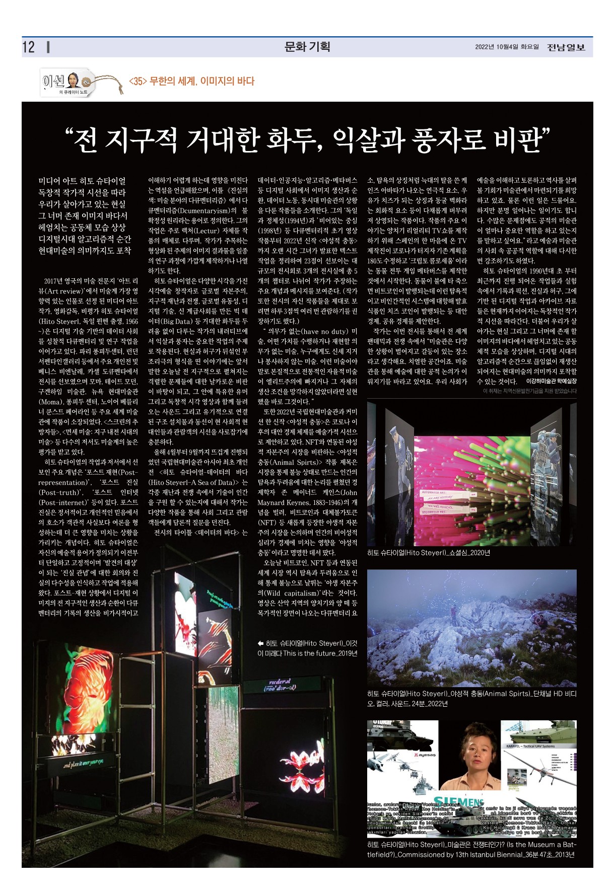 ¿ÃÇØ 4¿ùºÎÅÍ 9¿ù±îÁö ¶ß°Ì°Ô ÁøÇàµÇ¾ú´ø ±¹¸³Çö´ë¹Ì¼ú°ü ¾Æ½Ã¾Æ ÃÖÃÊ °³ÀÎÀü <È÷Åä ½´Å¸À̾ó-µ¥ÀÌÅÍÀÇ ¹Ù´Ù(Hito Steyerl-A Sea of Data)> ´Â °¢Á¾ Àç³°ú ÀüÀï ¼Ó¿¡¼ ±â¼úÀÌ Àΰ£À» ±¸¿ø ÇÒ ¼ö ÀÖ´ÂÁö¿¡ ´ëÇØ¼ ÀÛ°¡´Â ´Ù¾çÇÑ ÀÛǰÀ» ÅëÇØ »çȸ ±×¸®°í °ü¶÷°´µé¿¡°Ô ´ã·ÐÀû Áú¹®À» ´øÁø´Ù.