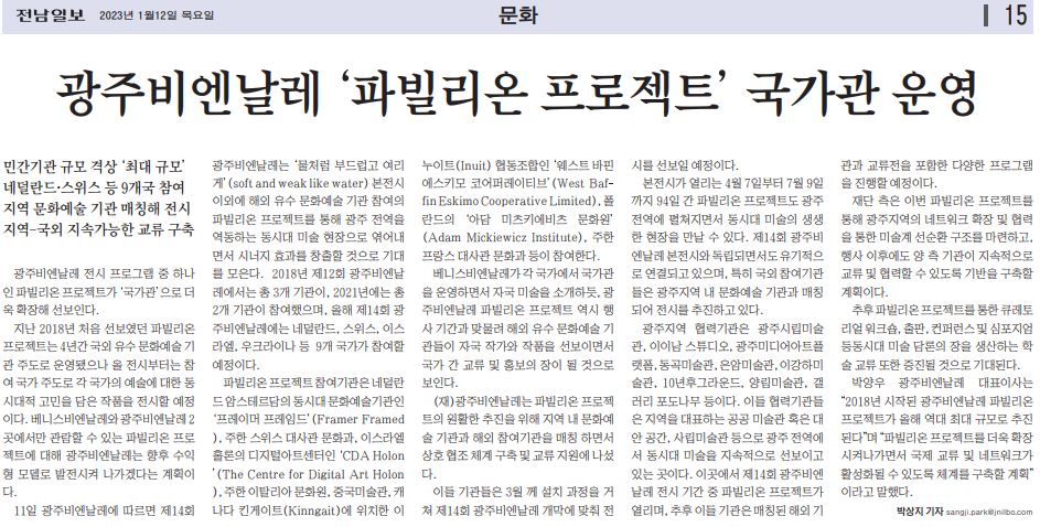 ±¤ÁÖºñ¿£³¯·¹ Àü½Ã ÇÁ·Î±×·¥ Áß ÇϳªÀÎ ÆÄºô¸®¿Â ÇÁ·ÎÁ§Æ®°¡ ¡®±¹°¡°ü¡¯À¸·Î ´õ¿í È®ÀåÇØ ¼±º¸ÀδÙ. Áö³ 2018³â óÀ½ ¼±º¸¿´´ø ÆÄºô¸®¿Â ÇÁ·ÎÁ§Æ®´Â 4³â°£ ±¹¿Ü À¯¼ö ¹®È¿¹¼ú ±â°ü ÁÖµµ·Î ¿î¿µµÆÀ¸³ª ¿Ã Àü½ÃºÎÅÍ´Â Âü¿© ±¹°¡ ÁÖµµ·Î °¢ ±¹°¡ÀÇ ¿¹¼ú¿¡ ´ëÇÑ µ¿½Ã´ëÀû °í¹ÎÀ» ´ãÀº ÀÛǰÀ» Àü½ÃÇÒ ¿¹Á¤ÀÌ´Ù. º£´Ï½ººñ¿£³¯·¹¿Í ±¤ÁÖºñ¿£³¯·¹ 2°÷¿¡¼¸¸ °ü¶÷ÇÒ ¼ö ÀÖ´Â ÆÄºô¸®¿Â ÇÁ·ÎÁ§Æ®¿¡ ´ëÇØ ±¤ÁÖºñ¿£³¯·¹´Â ÇâÈÄ ¼öÀÍÇü ¸ðµ¨·Î ¹ßÀü½ÃÄÑ ³ª°¡°Ú´Ù´Â °èȹÀÌ´Ù.