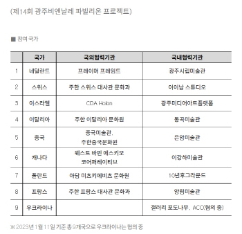 ÇØ¿Ü Âü¿©±â°üÀº ³×´ú¶õµå ¾Ï½ºÅ׸£´ãÀÇ ¹®È¿¹¼ú±â°ü ¡®ÇÁ·¹ÀÌ¸Ó ÇÁ·¹Àӵ塯(Framer Framed), ÁÖÇÑ ½ºÀ§½º ´ë»ç°ü, À̽º¶ó¿¤ Ȧ·ÐÀÇ µðÁöÅÐ ¾ÆÆ® ¼¾ÅÍ ¡®CDA Holon¡¯, ÁÖÇÑ ÀÌÅ»¸®¾Æ ¹®È¿ø, Áß±¹¹Ì¼ú°ü, ij³ª´Ù ¡®¿þ½ºÆ® ¹ÙÇÉ ¿¡½ºÅ°¸ð ÄÚ¾îÆÛ·¹ÀÌÆ¼ºê¡¯(West Baffin Eskimo Cooperative Limited), Æú¶õµå ¡®¾Æ´ã ¹ÌÃ÷Ű¿¡ºñÃ÷ ¹®È¿ø¡¯(Adam Mickiewicz Institute), ÁÖÇÑ ÇÁ¶û½º ´ë»ç°ü µîÀÌ´Ù. Âü¿©±â°üÀº ¿À´Â 3¿ù ¼³Ä¡¸¦ ½ÃÀÛÇØ Á¦14ȸ ±¤ÁÖºñ¿£³¯·¹ °³¸·ÀÏ¿¡ ¸ÂÃç °í±¹ÀÇ ÀÛǰÀ» ¼±º¸ÀδÙ.