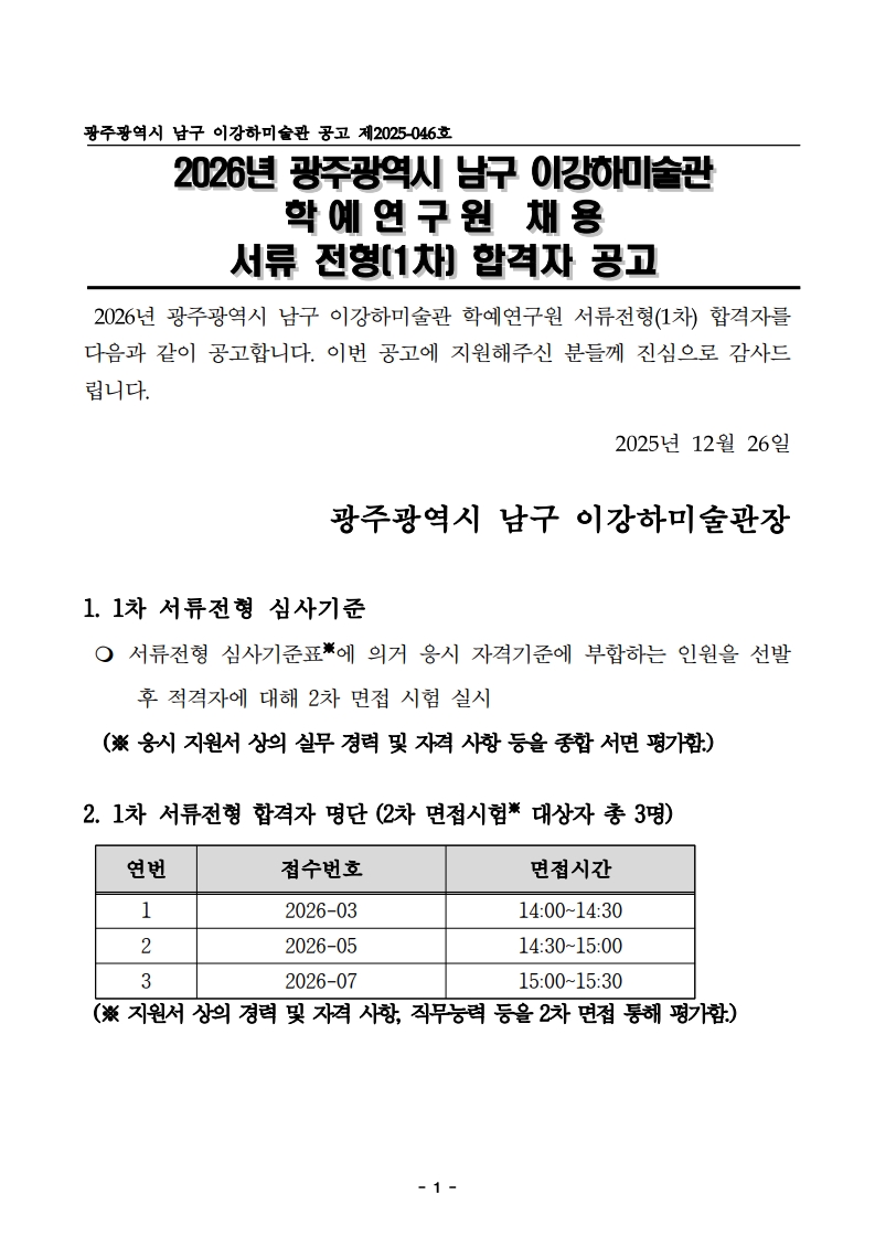 [¾È³»] 2026 À̰ÇϹ̼ú°ü Çп¹¿¬±¸¿ø 1Â÷ ¼·ùÇÕ°ÝÀÚ ¹ßÇ¥